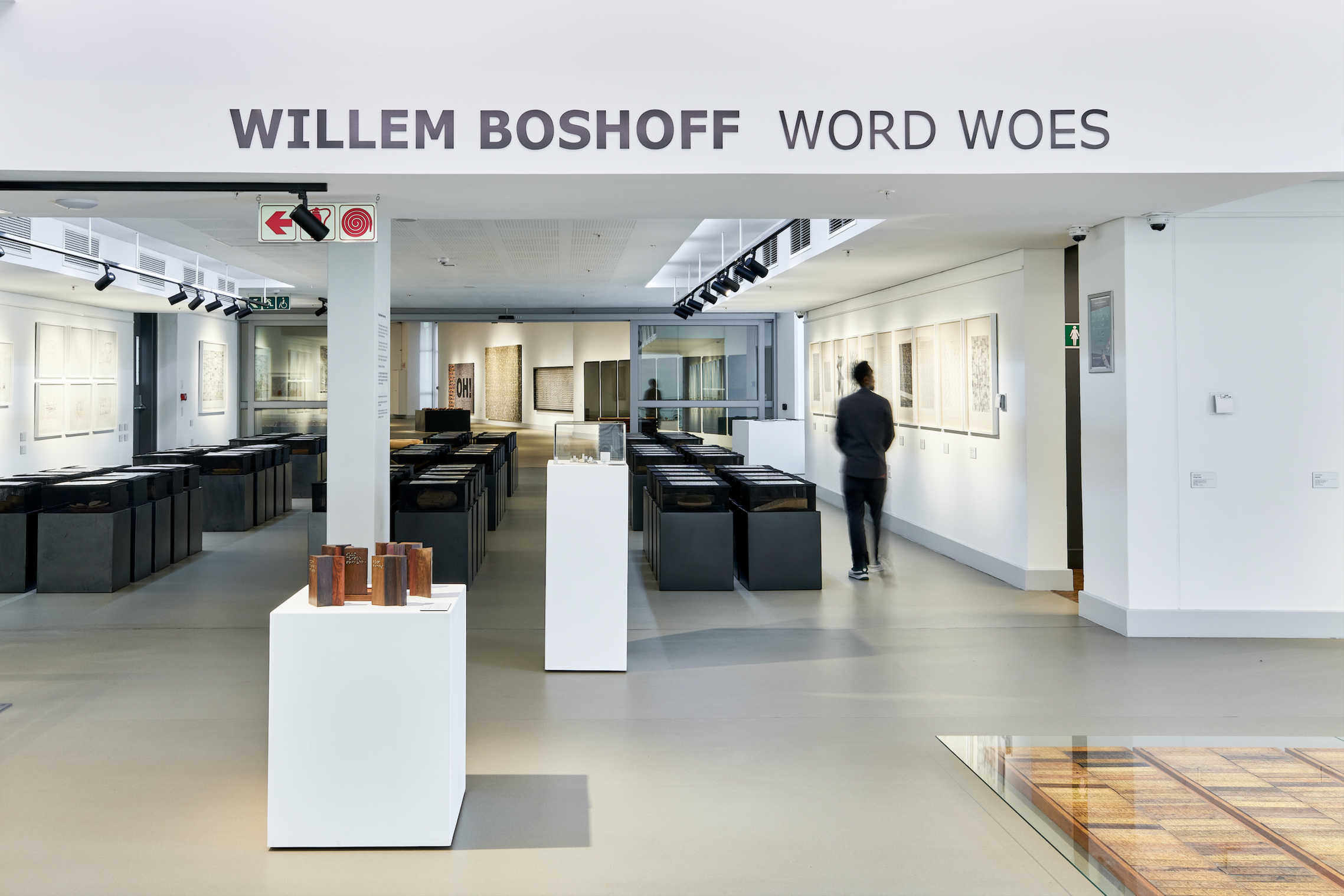 Curated by Helene Smuts, the exhibition Word Woes presented as a retrospective of works spanning the duration of Willem Boshoff’s artistic practice. The exhibition title and didactics worked to compliment Boshoff’s existing artwork style references.